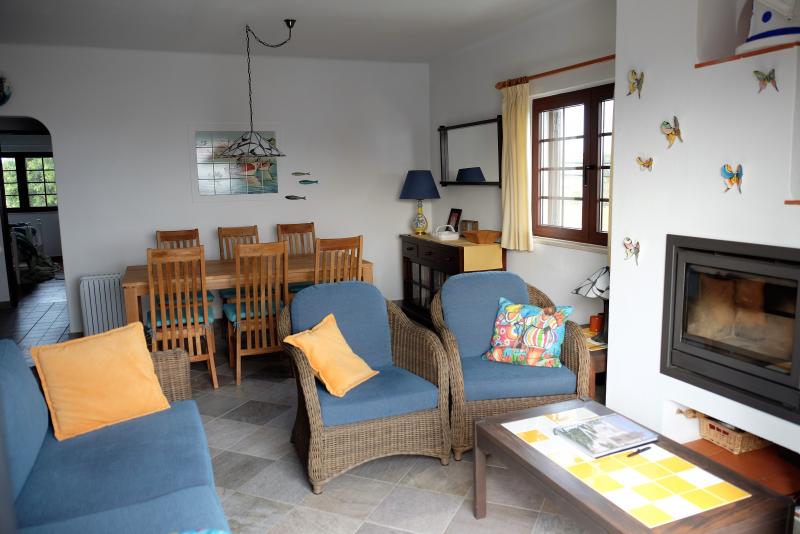 Couchgarnitur, Tisch, 6 Stühle, geschlossener Kamin, Essecke, Ein Hochstuhl für Babys ist vorhanden, sowie ein hoher Stuhl für kleinere Kinder.