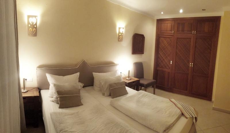 1 Doppelbett, Klimaanlage, Einbauschrank, Bad separat, Safe, Fensterläden + Vorhänge, stummer Diener, Nachttische, Leselampen.