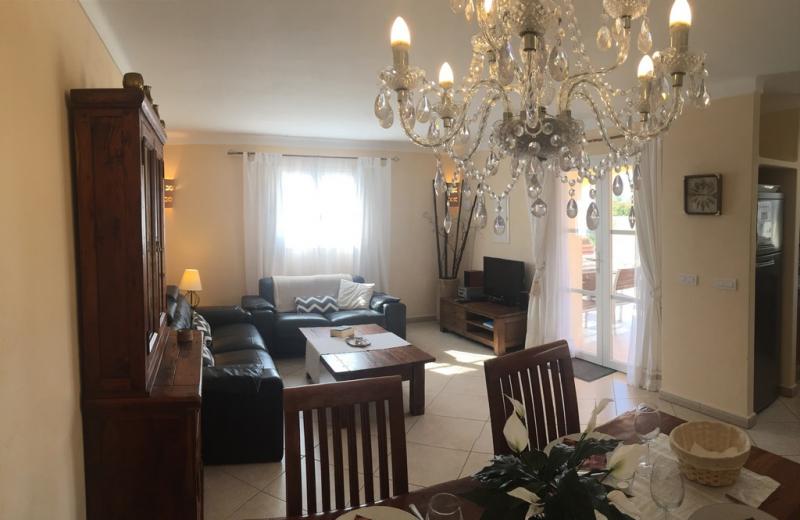 Couchgarnitur, Tisch, 4 Stühle, 2 Ledersofas, Bücherschrank mit deutschen und spanischen Büchern, Fernseher mit Sat-Antenne und Antenne für spanisches Fernsehen, Radio/CD/DVD-Player, Internet per W-Lan