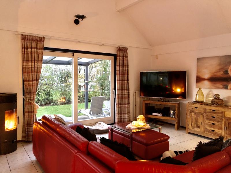 EG: Helles Wohn/Esszimmer mit Kamin, moderne neue Einbauküche, 1 Schlafzimmer, Bad mit Sunshower und Finnische Sauna "Wellness pur"