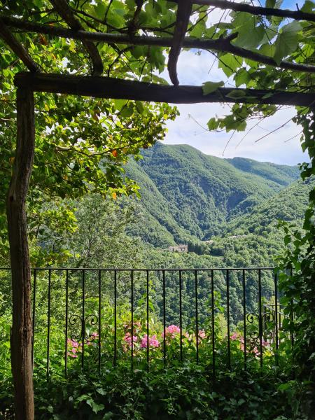180 m² Grundstück, Garten, Gartenmöbel, Terrasse(n), Balkon, Veranda, Panorama-Balkon, Seitengärten mit Pergola und Steintisch, stattliche Palme und zwei private Naturstein-Terrassen, die den Talblick nach Süden freigeben, aber selbst fast nicht eingesehen werden können