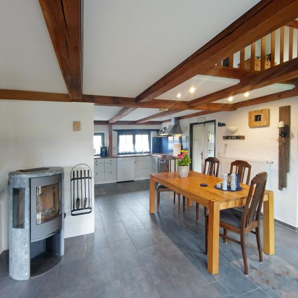 Couchgarnitur, 2 Sessel, Tisch, 6 Stühle, Kaminofen