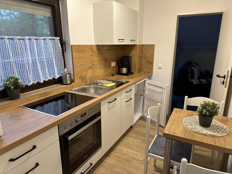 separate Küche, Backofen, Elektroherd, 4-Platten-Herd, Kühlschrank, Gefrierfach, Mikrowelle, Toaster, Kaffeemaschine, extra: Wasserkocher