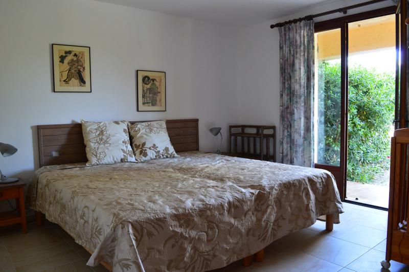 Doppelbett und Kinderbett mit Zugang zum Garten.