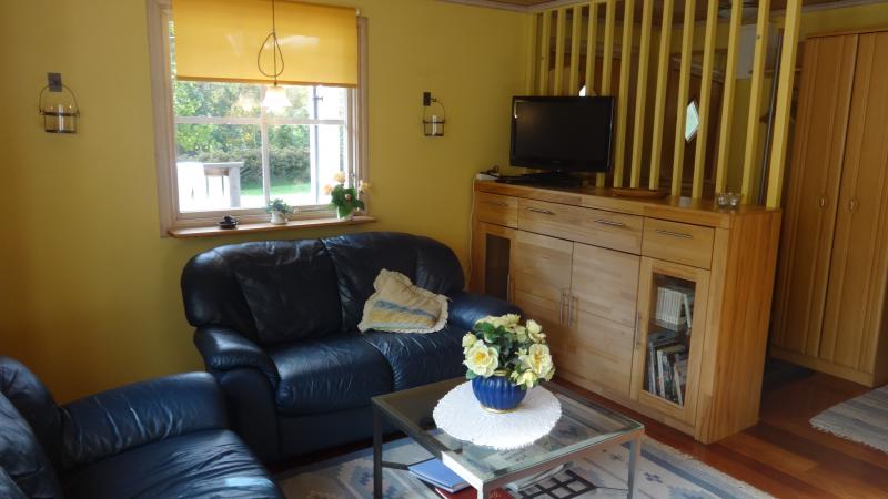 Couchgarnitur, Tisch, 6 Stühle, geschlossener Kamin, Essecke, Im Wohn- Essbereich und im Flurbereich liegt Teakholzparket. Das Haus verfügt über einen Flachbildschirm mit Sat- Anlage, Bücher und Gesellschaftsspiele.