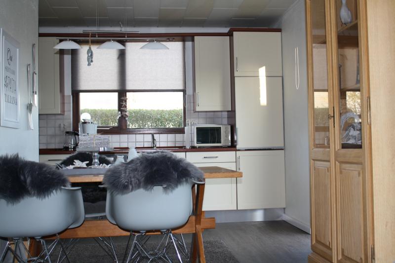 offene Küche, Backofen, Gasherd, Kühlschrank, Gefrierfach, Gefrierschrank, Mikrowelle, Spülmaschine, Toaster, Kaffeemaschine, Separater Kühlschrank für Flaschen, kleiner Gefrierschrank im Schuppen.